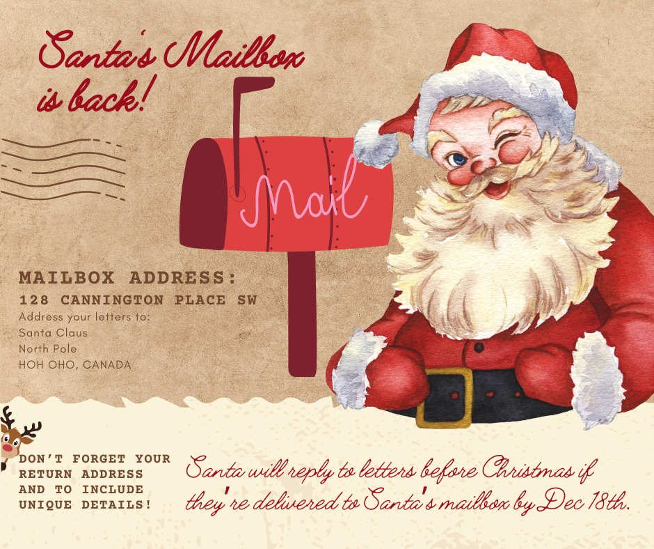 The North Pole mailbox is located at 128 Cannington Place SW – this mailbox mails your letters directly to Santa. It is arriving on November 15th, 2025!!!!